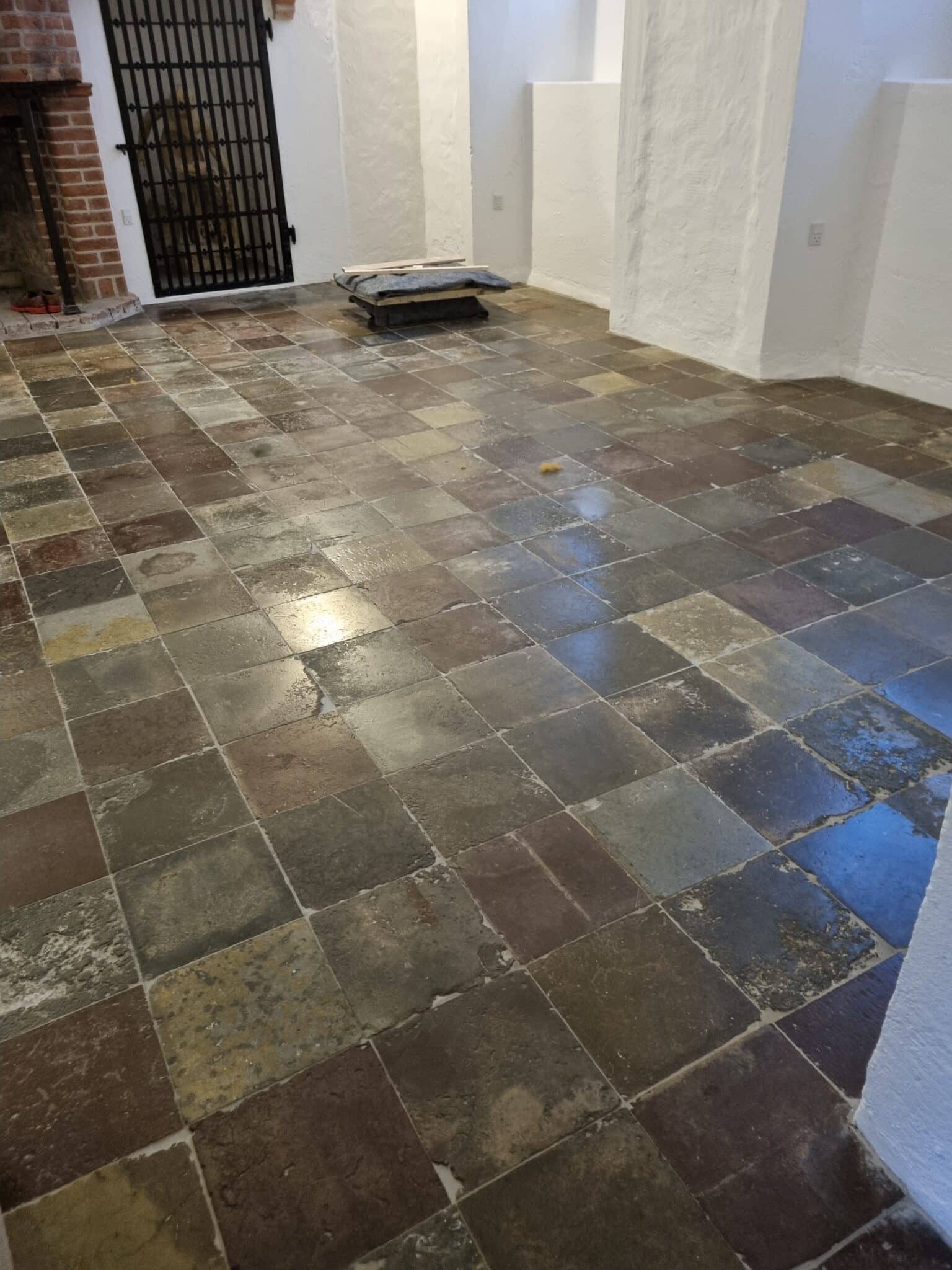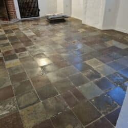 Polering af 400 år gammelt stengulv før Polering af 400 år gammelt stengulv efter