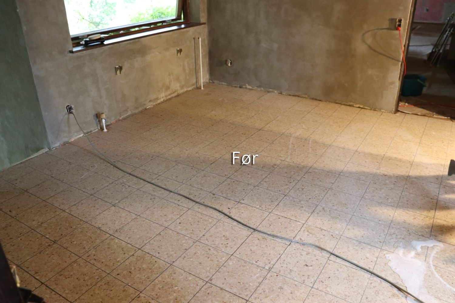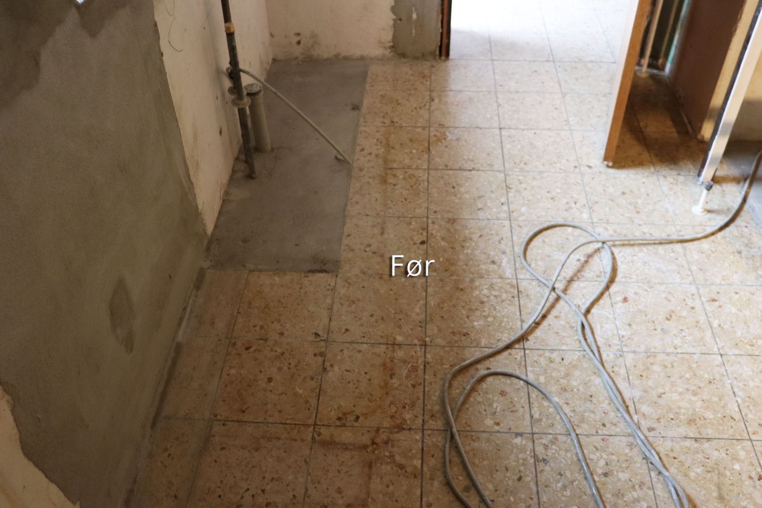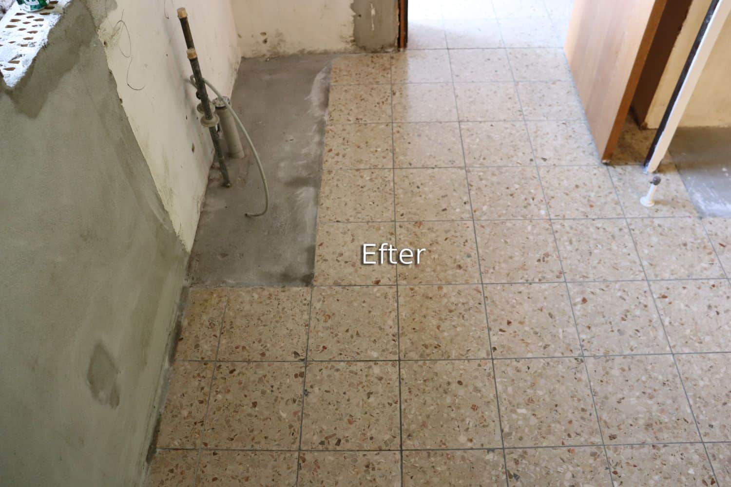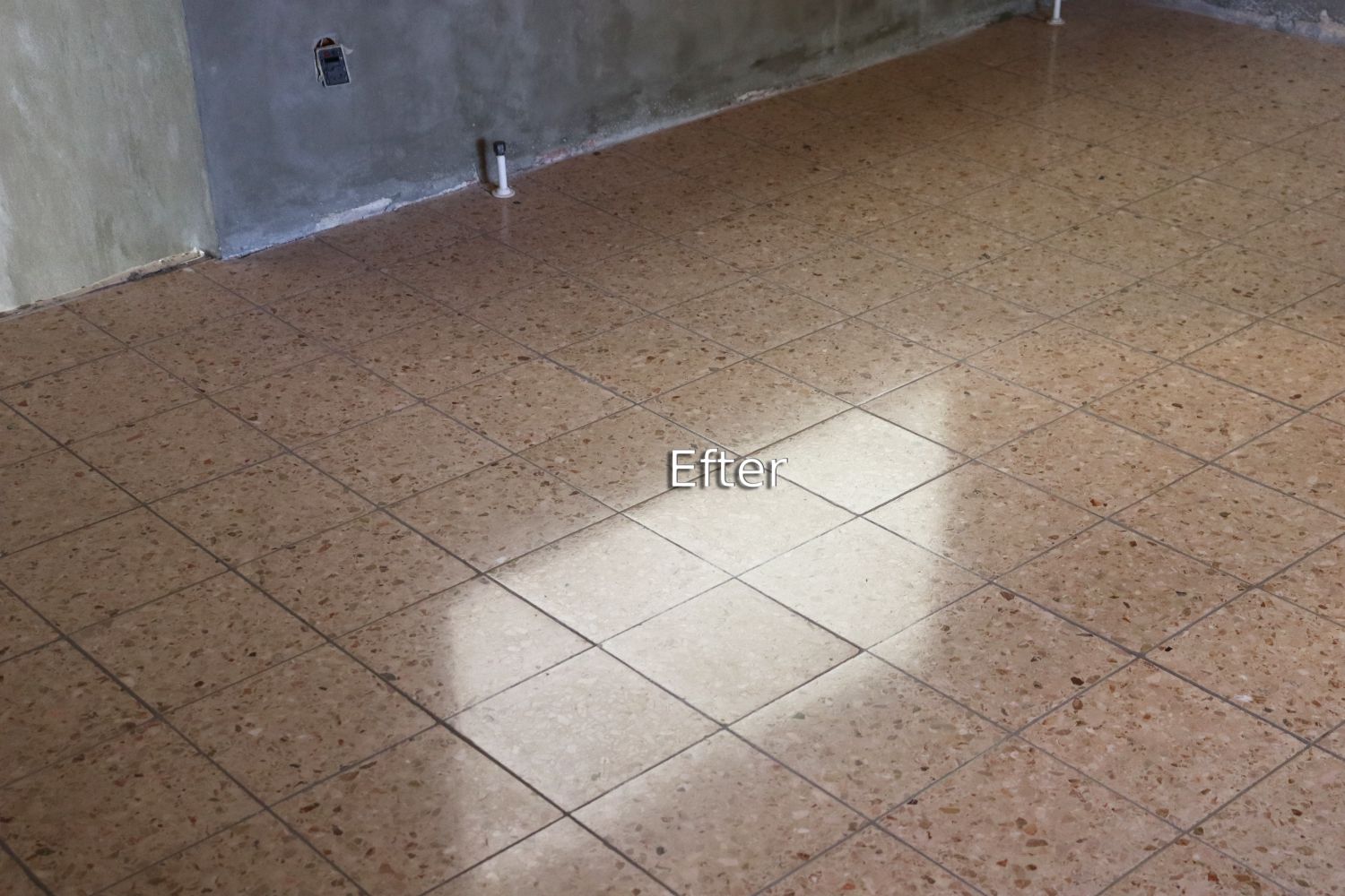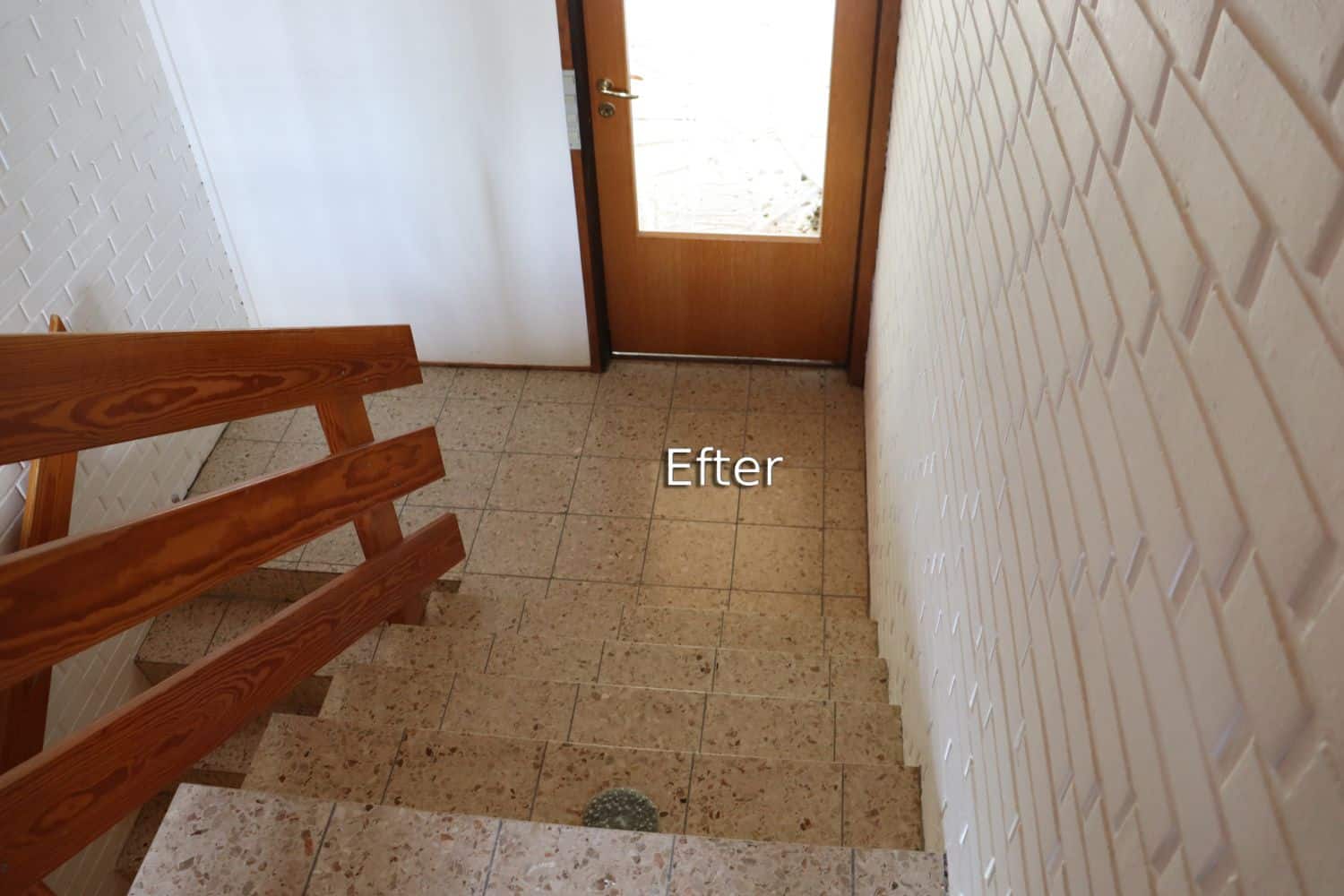 Gulvet på billederne herunder er et marmorsplitgulv. Det er blevet fint slebet og poleret op igen. Det giver rummene et helt anderledes lys, og gulvet fremstår rent og blankt. De er hermed også nemmer at rengøre i den daglige rengøring.